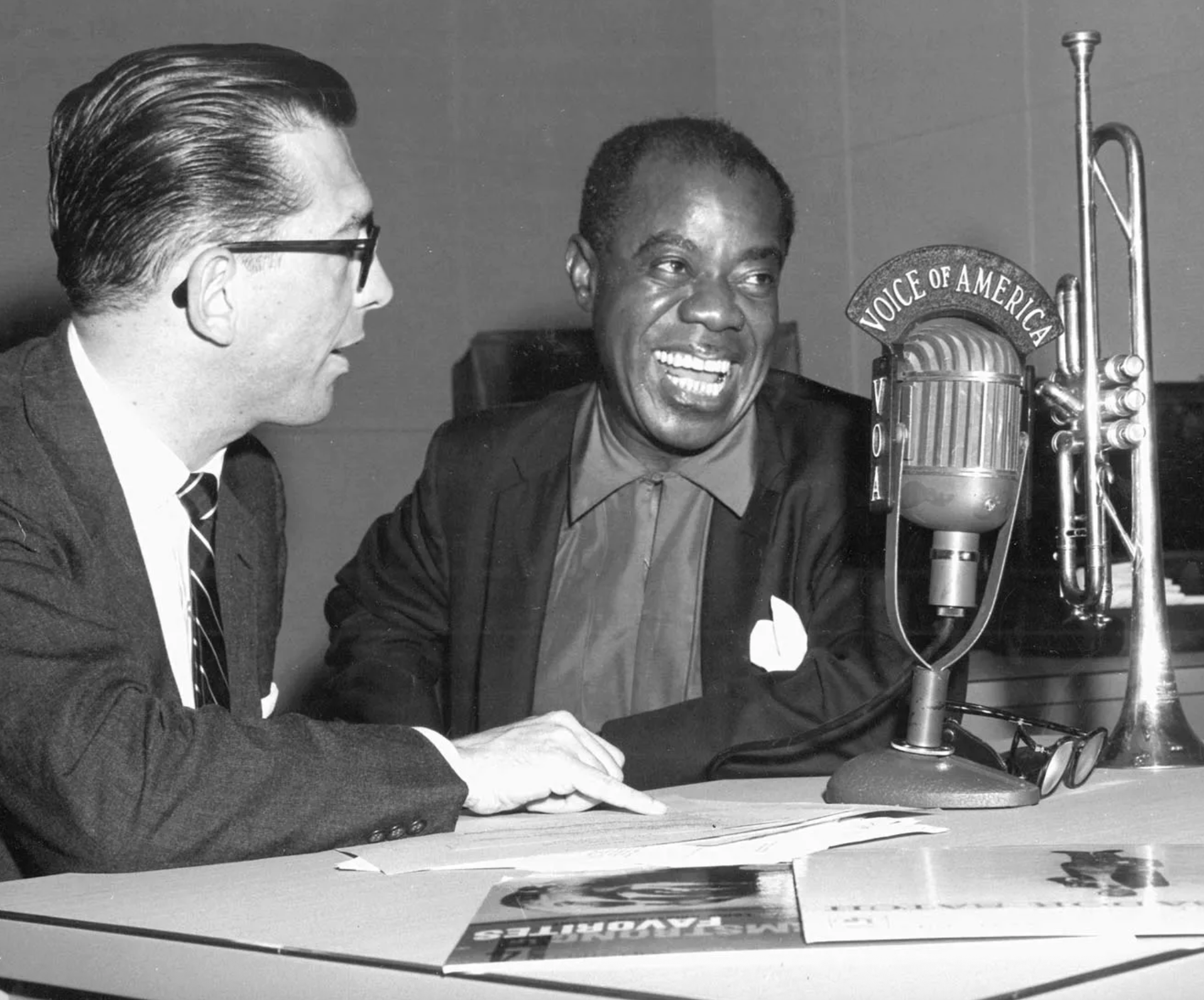 Willis Conover (left), an American jazz producer and broadcaster on the Voice of America for more than 40 years, interviews famed musician Louis Armstrong in 1955.