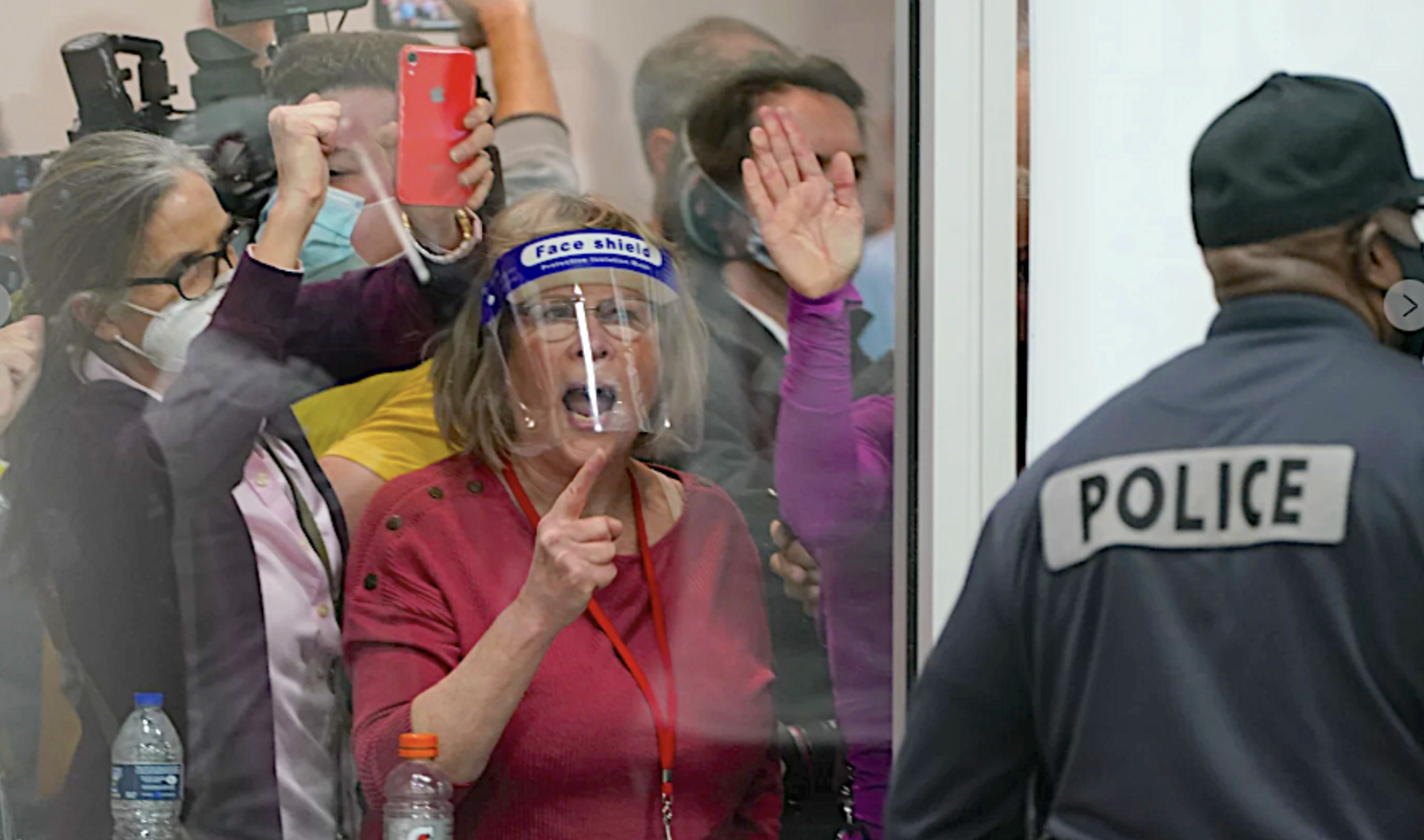 Election challengers in Detroit yell as they look through the windows of the central counting board in November 2020. Photo by The Associated Press