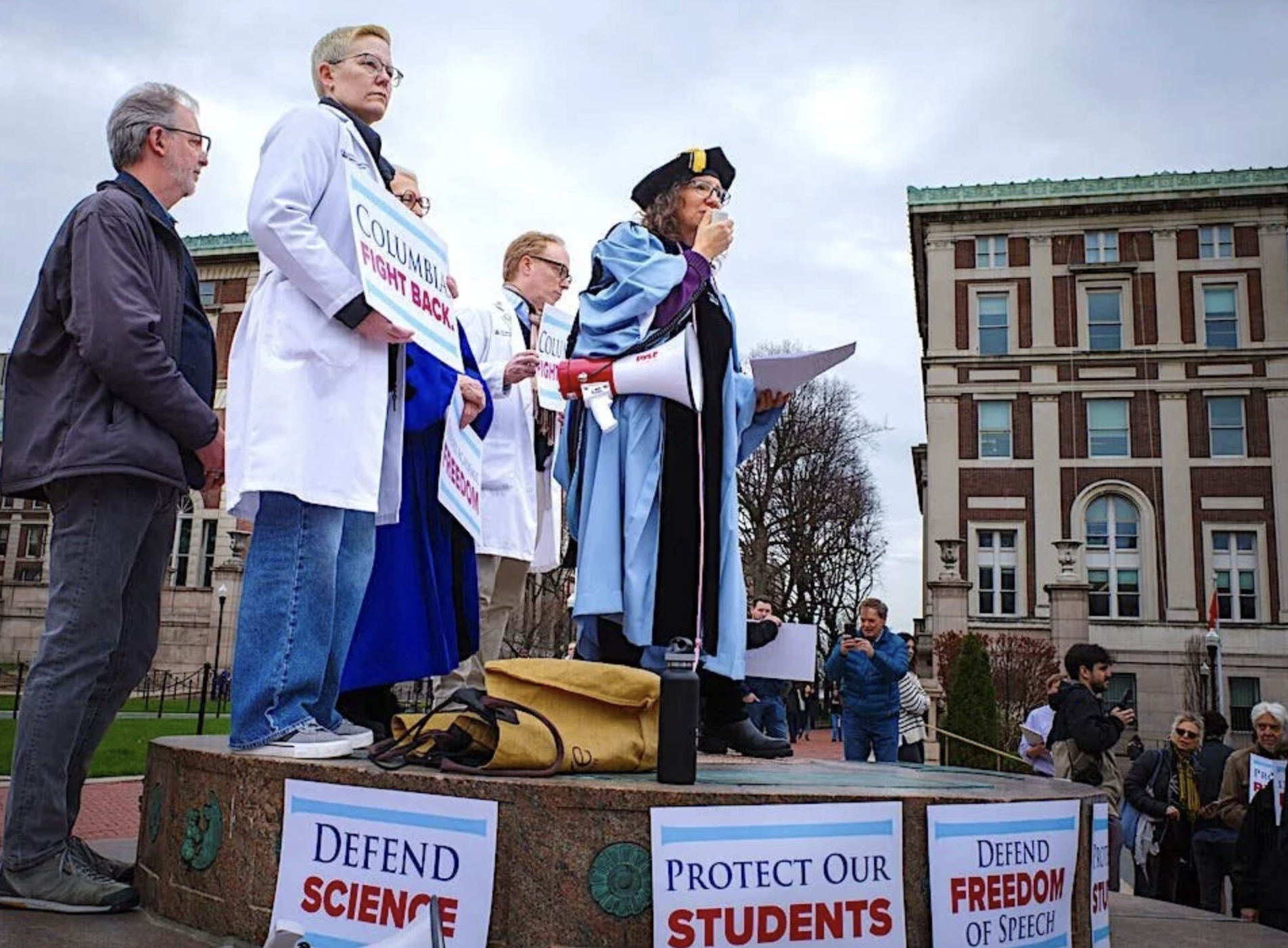 Columbia University faculty at a rally on Monday against federal funding cuts. The university last month agreed to major concessions that the federal administration demanded. Photo by Graham Dickie / The New York Times